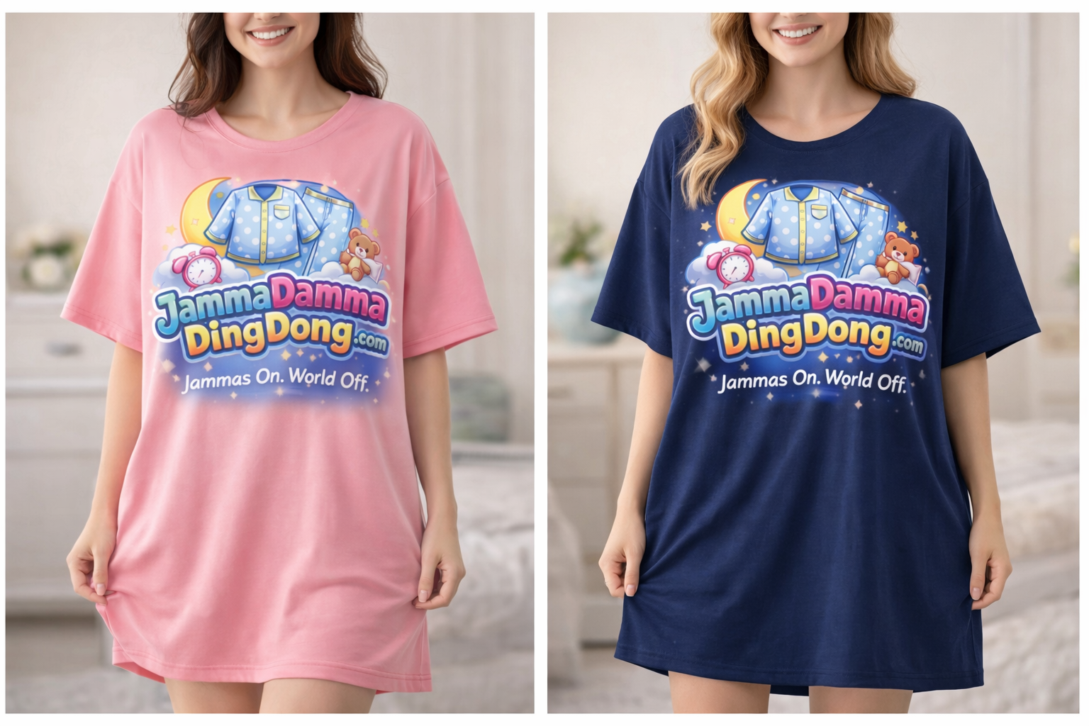 Comfortable sleep shirts in vibrant colors with Jamma Damma Ding Dong logo.